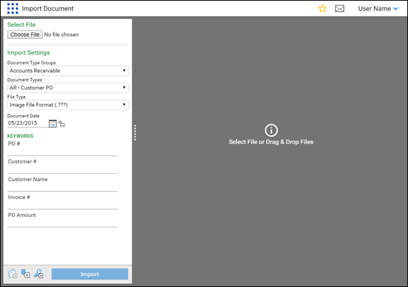 Document import consists of a two-stage process. Users either browse to a file location and select a file to import, or users can drag and drop a file onto the document import screen. The document is held in a Document Queue while Document Type and Keyword information is added. Once the necessary information is entered, the document can be imported into OnBase. Depending on your configuration settings, you can also preview image files for easier indexing. With the EDM Services license, up to five documents can be imported at once.